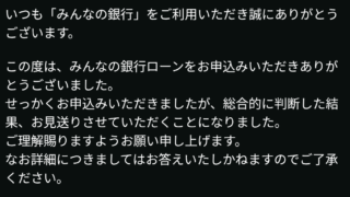 サラ金からの借り入れは総量オーバーにつき不可。 ならば銀行系はどうだ? と、 昨年、一次審査通過後に否決された みんなの銀行に淡い期待を抱く。 が、駄目。 毎度毎度、否決の知らせが頭にくる。 もう借り入れは諦めよう。 次の審査で落ちたら、俺...