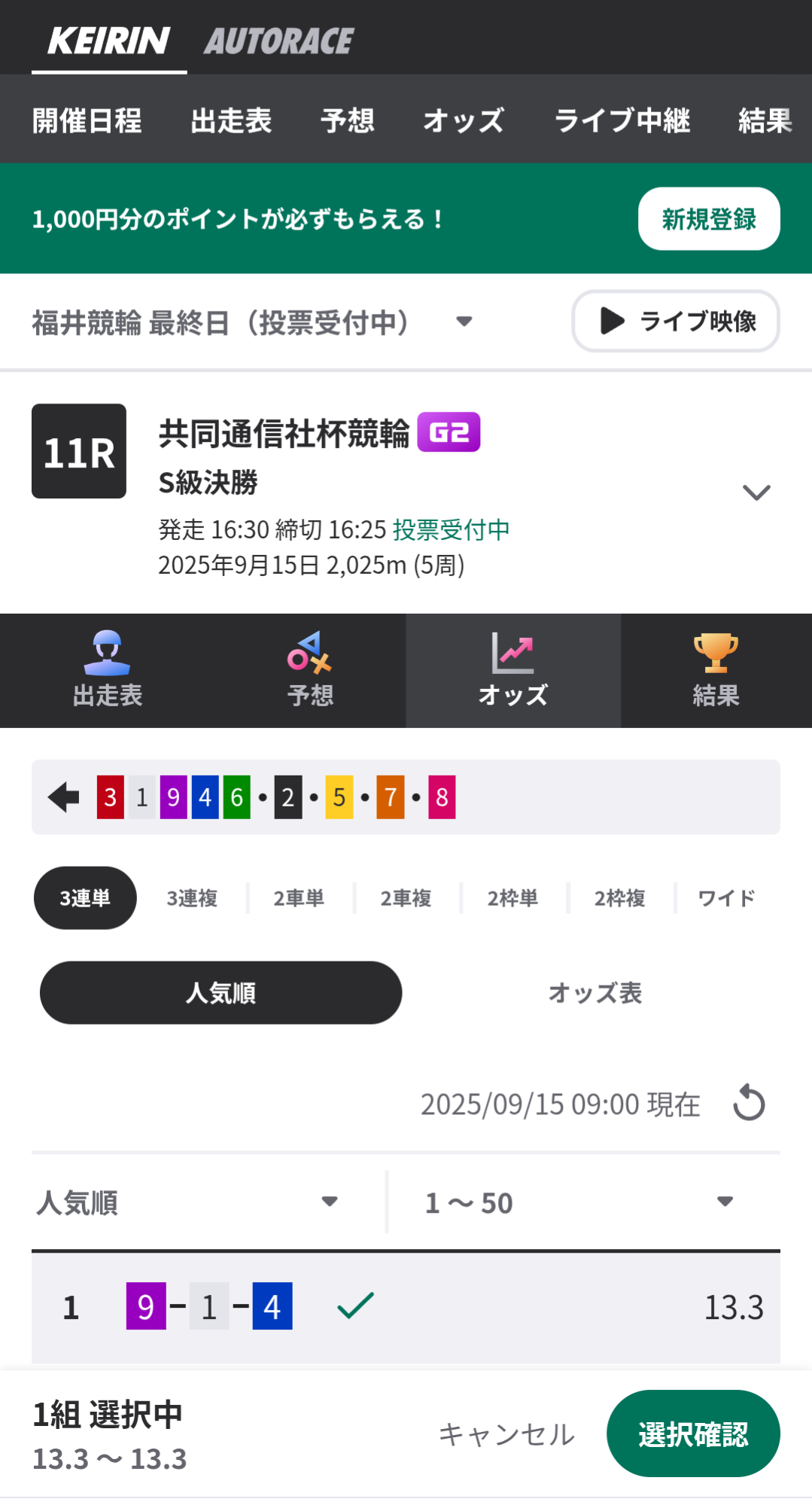 共同通信社杯競輪 決勝 未分類 2025.09.15 ここを穫れば南修二のGP濃厚。 近畿も五車連携なら勝たせる走りになるか。 ここは古性の番手まくりからすんなり 914の万張りで うぅ…。 賭けたい。